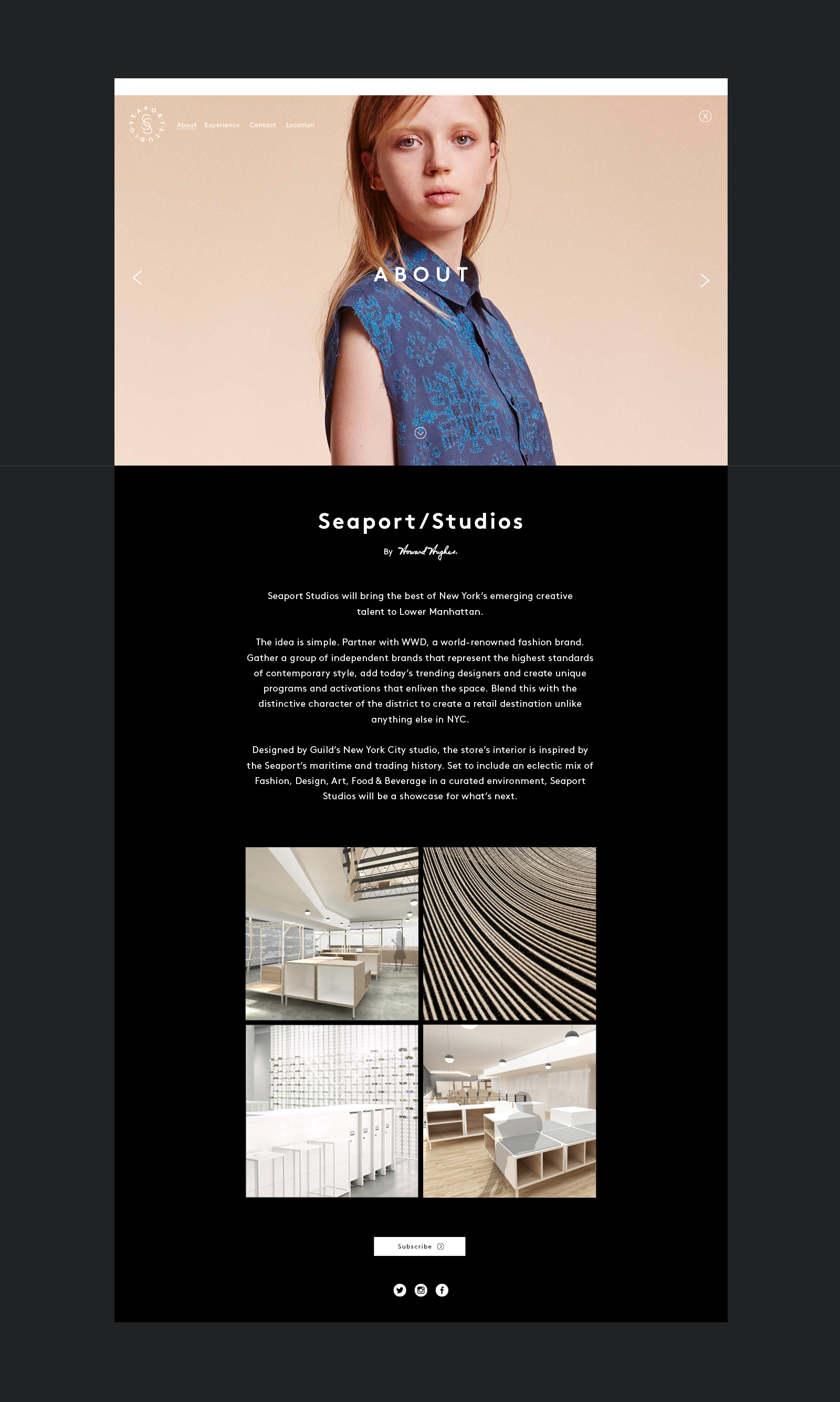 Seaport Studios is a 5,000 square-foot two-story pop-up space that showcases a rotating selection of wares from emerging fashion designers. It also features an art gallery and a coffee bar. The project is a collaboration between Seaport owner Howard Hughes Corporation and Women's Wear Daily. It is envisioned as an eclectic mix of fashion, art, food and beverage in a curated environment.